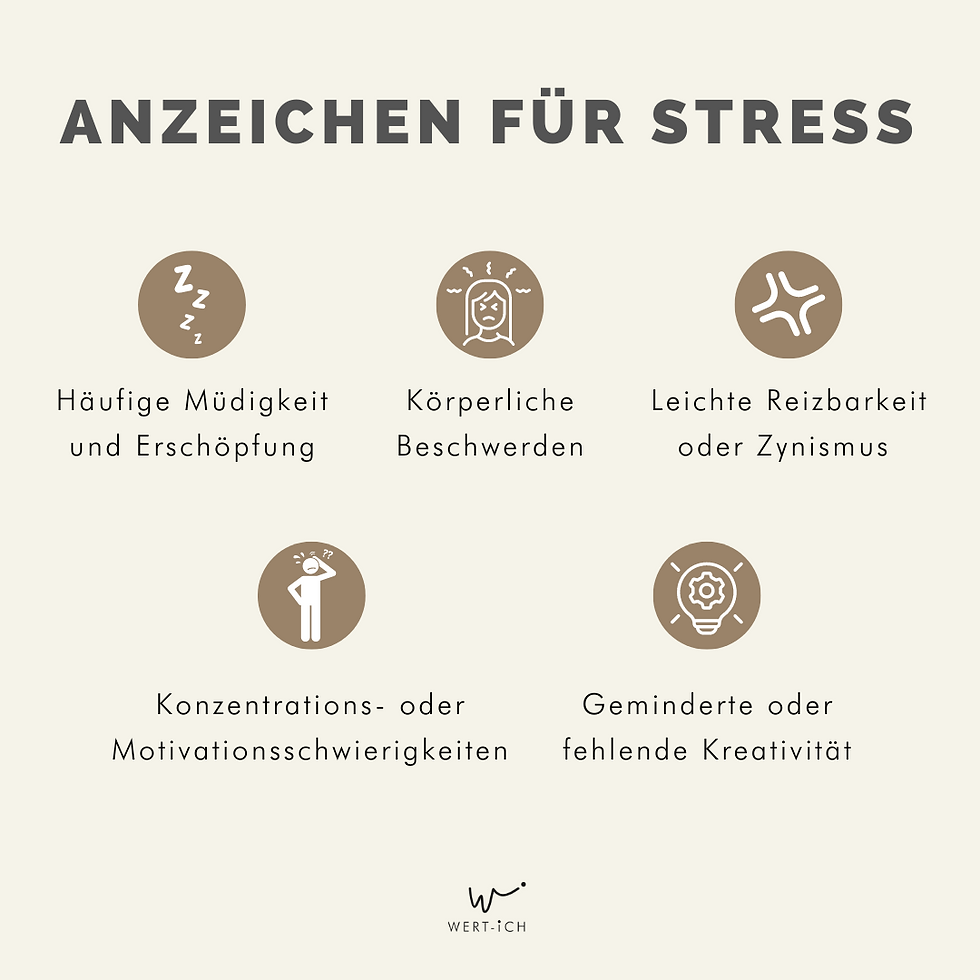 In dieser Grafik siehst du nochmal die 5 Anzeichen, die für Stress stehen können: